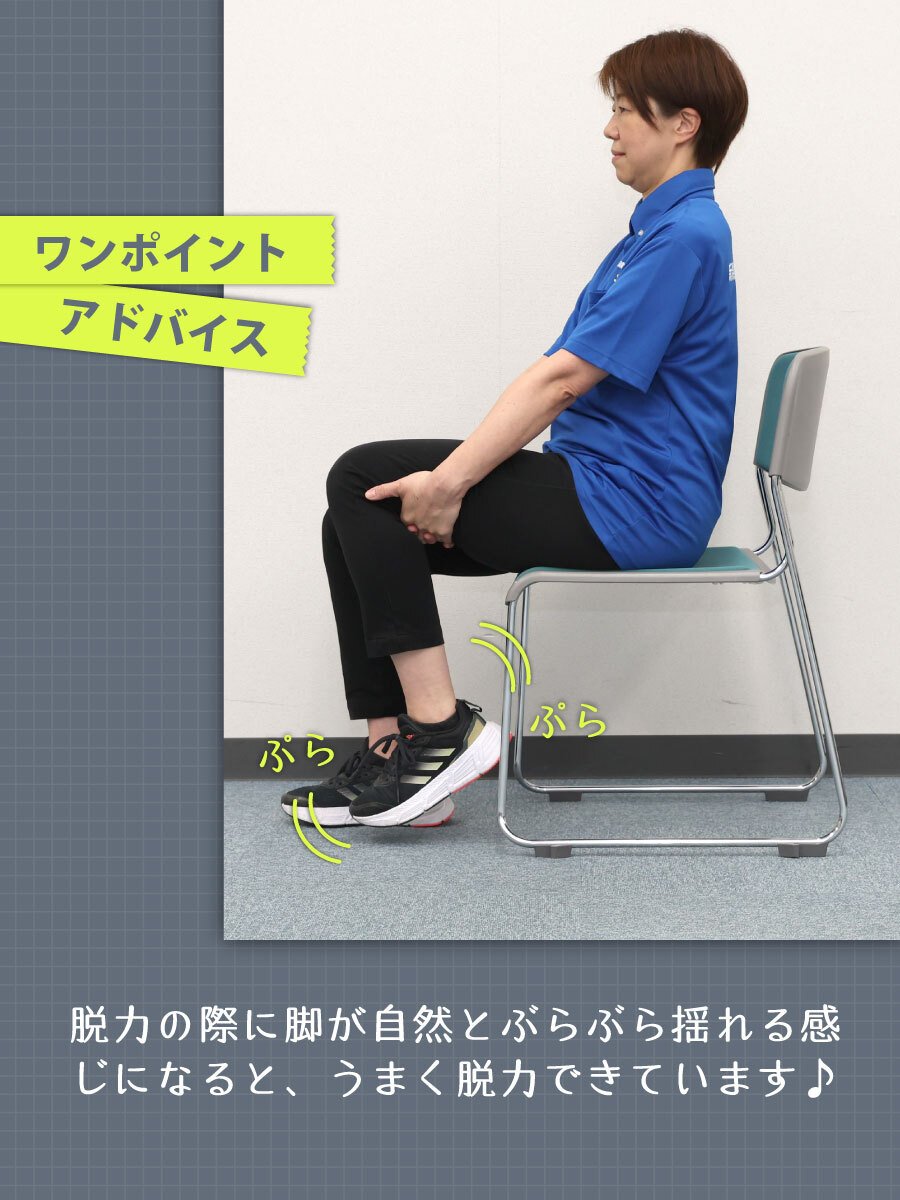 脱力の際、脚が自然とぶらぶらと揺れる感じになると、うまく脱力できています。