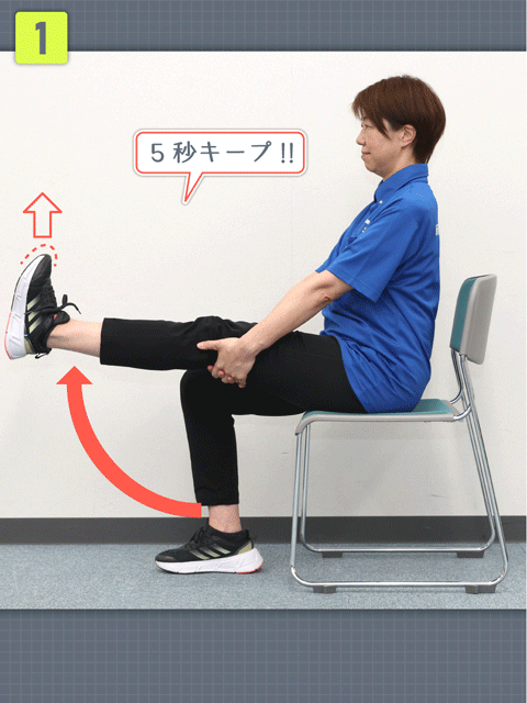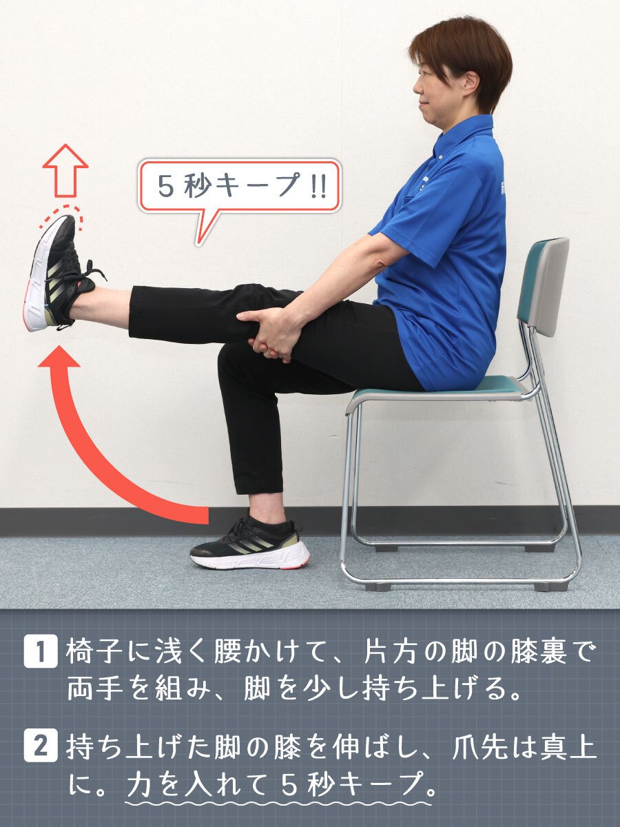 (1)椅子に浅く腰かけて、片方の脚の膝裏で両手を組み、脚を少し持ち上げる。持ち上げた脚の膝を伸ばし、爪先は真上に。力を入れて5秒キープする。