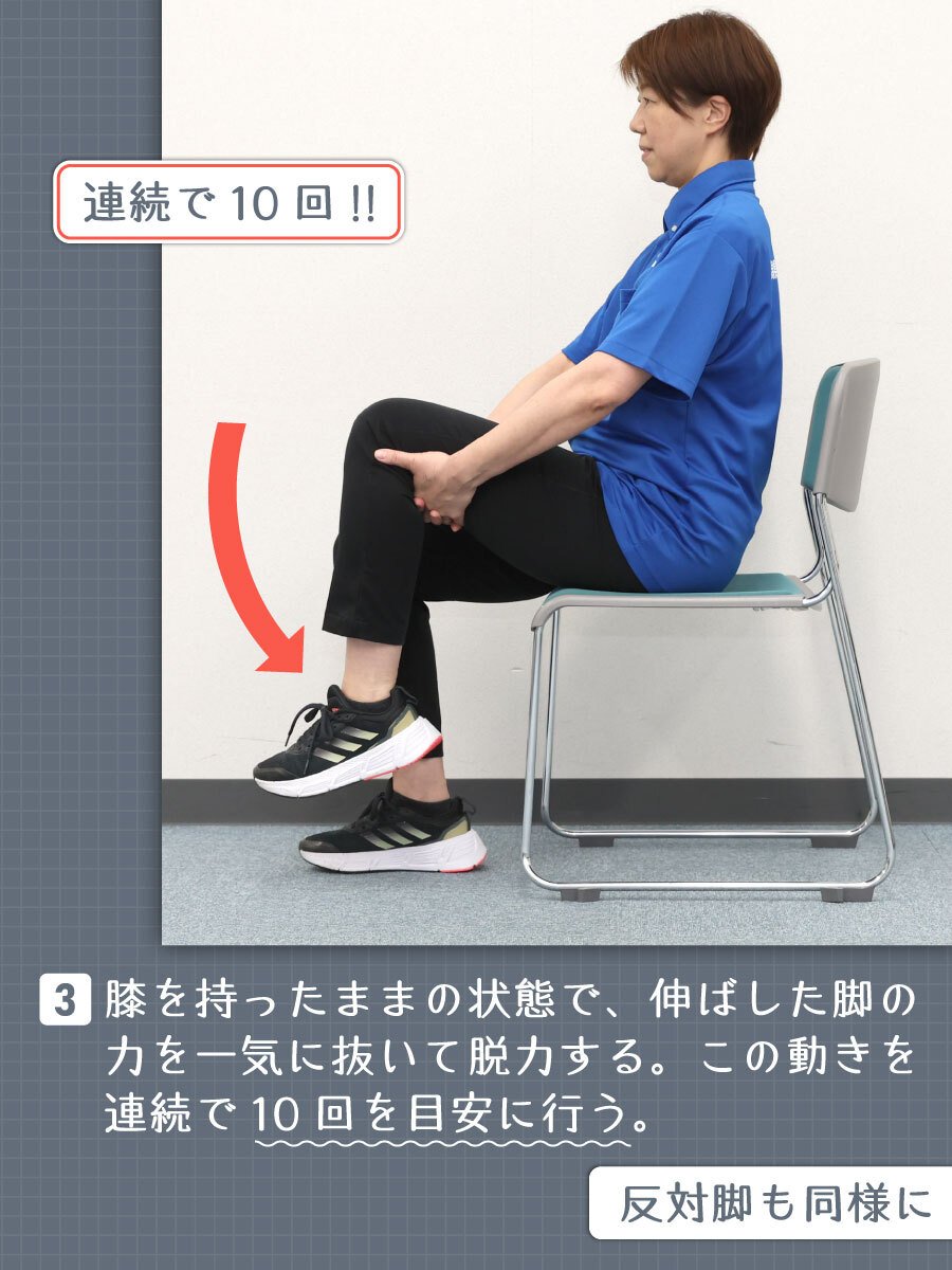 (2)膝を持ったままの状態で、伸ばした脚の力を一気に抜いて脱力する。この動きを連続で10回を目安に行う。反対脚も同様に。