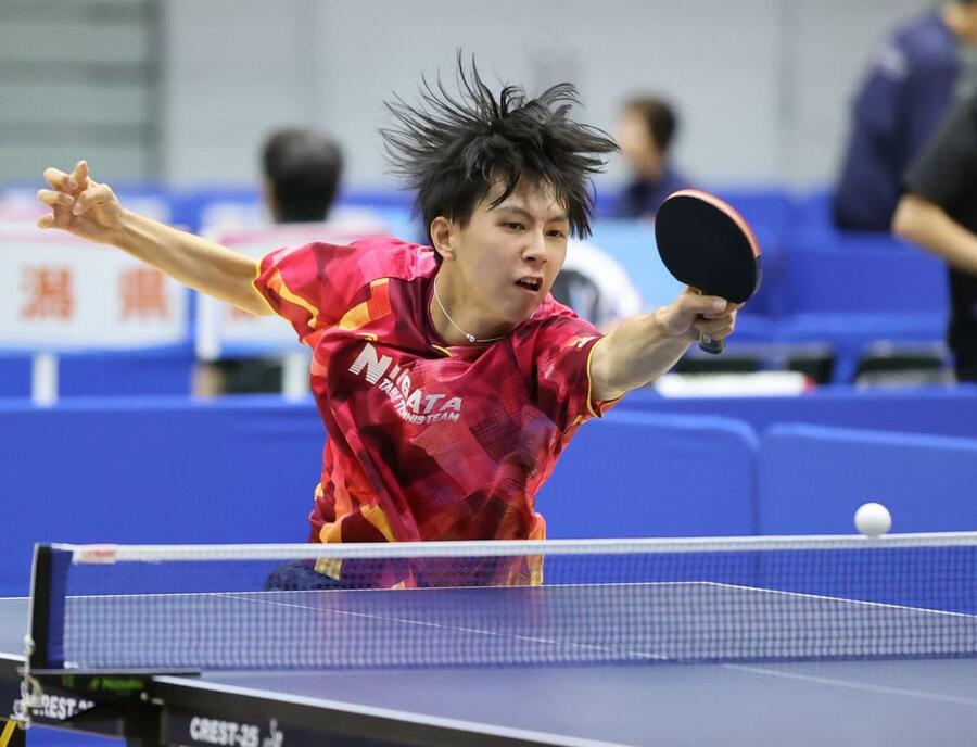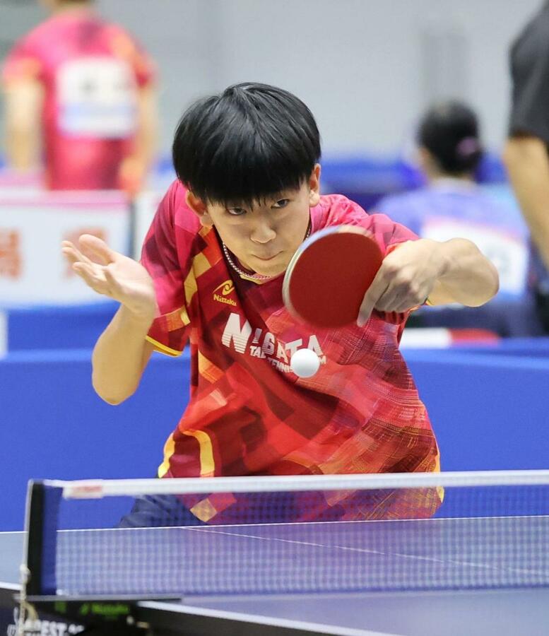 卓球少年男子 山形を相手にシングルスを戦う山岸駿=滋賀県野洲市