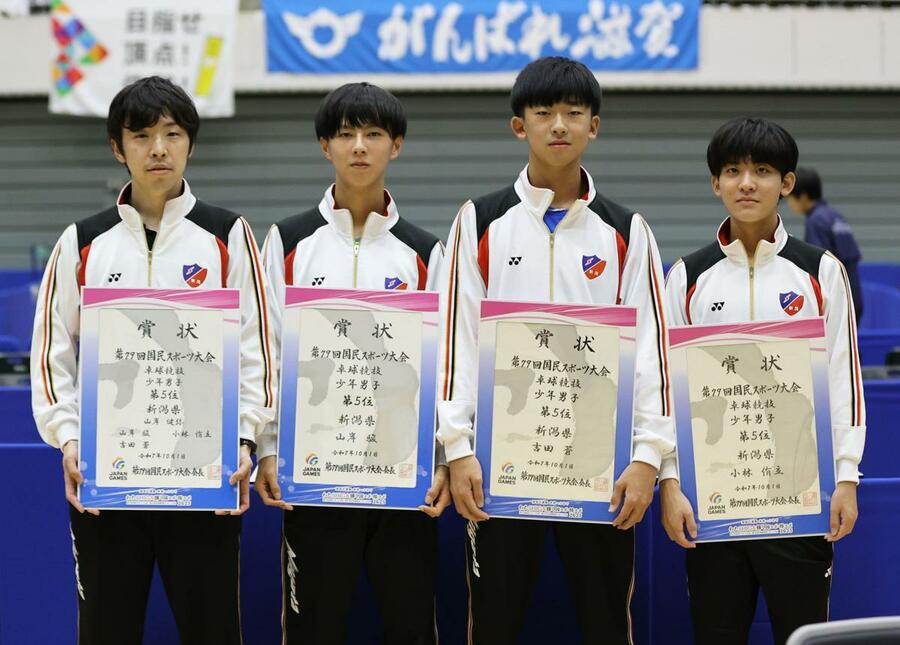 卓球少年男子で5位入賞した新潟県チームの選手ら=滋賀県野洲市
