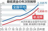 2025年度の最低賃金(時給)が改定され、10月から順次、全国の都道府県で適用が始まりました。新潟県は985円から65円引き上げられ、初めて1000円を超え1050円となり、2日に適用されました。引き上げ額は最低賃金を時給で示すようになった02年度以降で最大。ただ、それでも新潟の最低賃金は全国平均の1121円(加重平均)を下回り、全国中位止まりです。では、近隣県や関東と比べると、どのようなランクにあるのでしょう?厚生労働省の公表データから読み解いてみました。