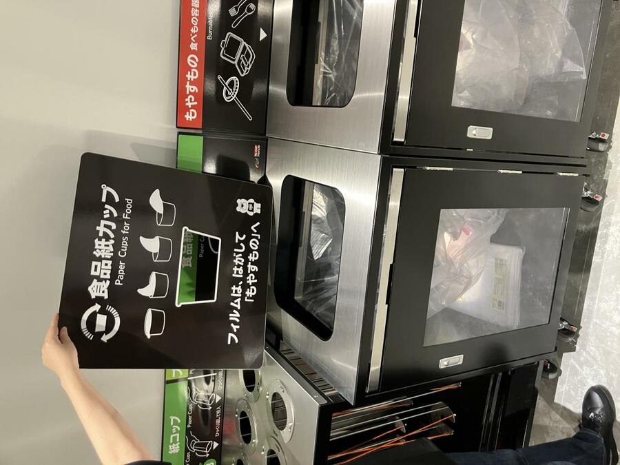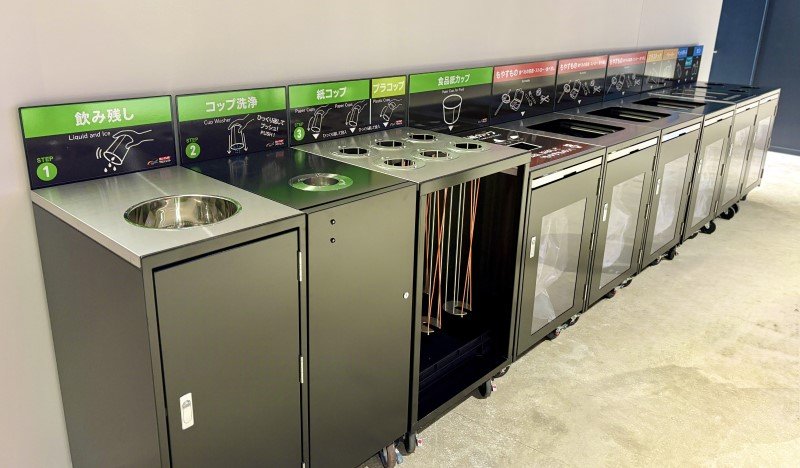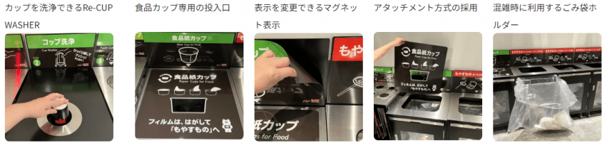 TOYOTA ARENA TOKYOでは、全15ヶ所のリサイクルステーションのうち、7ヶ所がRe-CUP WASHERや専用の飲料・食品用紙カップ回収機が完備された「Re-CUPステーション」となります。来場者の皆さまの入退場の導線に合わせた配置や、海外の方にも視覚的にわかりやすい分別の表現と投入口、興行内容によって回収する資源を変更できるアタッチメント方式(投入口や表示を簡単に変更できる仕組み)など、様々な工夫が施されています。