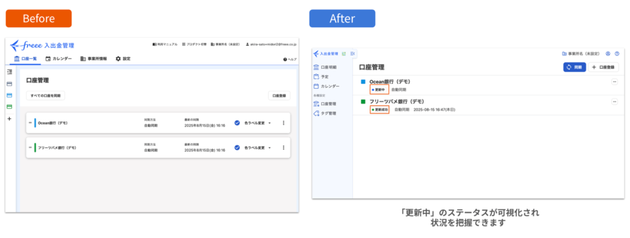 口座管理画面において、連携口座のステータス表示が追加され、同期中の場合「更新中」のステータスを表示し、状況を可視化します。