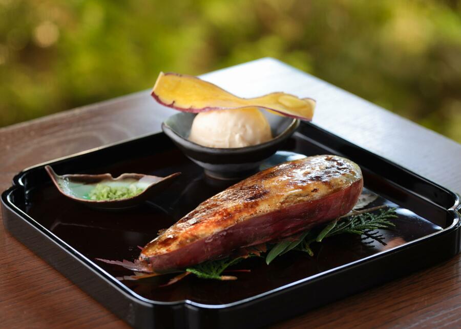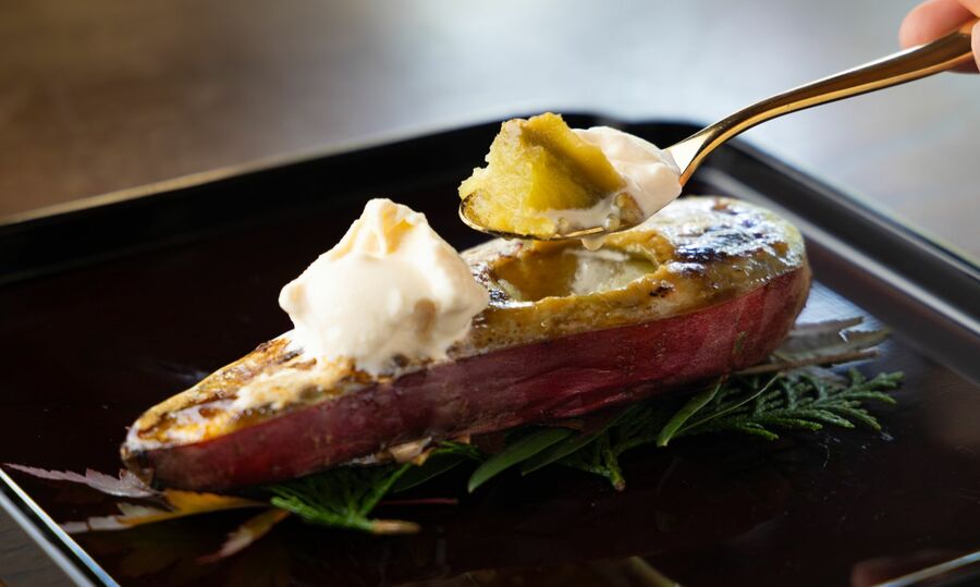さらに、添えられたバニラアイスと共にお召し上がりいただくと、深みのあるまろやかな味わいが広がります。また、コンディメントとして抹茶塩もご用意。さつまいもやアイスに加えることで、ほのかな塩気が甘みを一層際立たせ、味の変化もお愉しみいただけます。