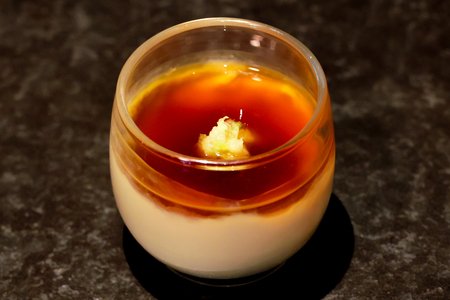 ふんわり軽い口当たりに仕上げたブランマンジェに、牛乳と生クリームで溶いた抹茶ソースを合わせたデザート。