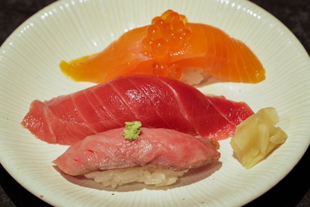 醤油の香ばしさとみりんの甘みが染み込んだ旨味たっぷりの牛肉を、甘酸っぱい寿司飯とともにお楽しみいただけます。(*「松阪牛ロース煮寿司」は、写真内で一番手前の一貫)