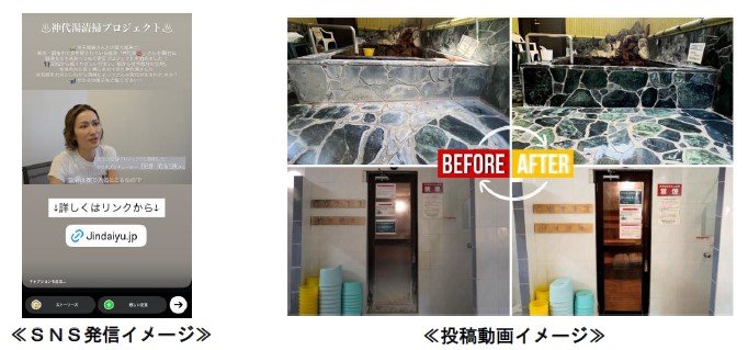 本実証実験では、蓄積された汚れが目立つ洗い場のタイルや浴槽、湯口などをプロの技術で磨き上げ、清潔に生まれ変わった空間をSNSやWebコンテンツに発信するほか、対象施設にちなんだ「神代湯の楽しみ方」などを発信し、誘客支援を実施します。