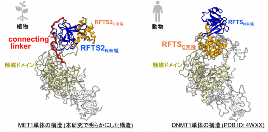 MET1の触媒ドメイン(黄)にはRFTS2ドメインのN末端領域(青)が、DNMT1の触媒ドメインにはRFTSドメインのC末端領域(オレンジ)が入り込んでいる。さらに、MET1におけるDNA結合の阻害は、RFTS2ドメインだけでなくconnecting linker(赤)も関与することを発見した。