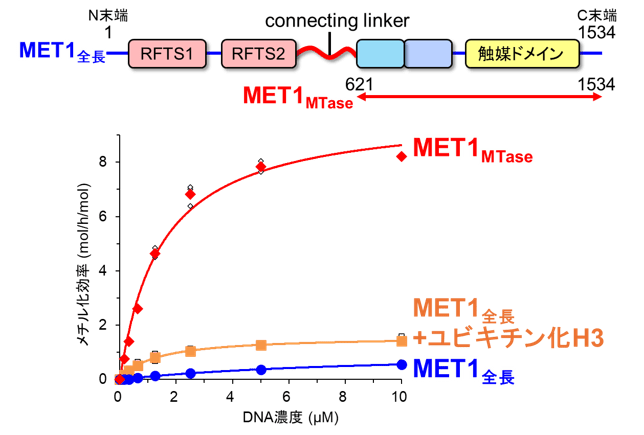 活性実験で使用した触媒ドメインのみのMET1 (MET1MTase) は、ドメイン構造下部の赤矢印で示した領域から構成される。活性実験では、MET1の片鎖メチル化DNAに対するメチル化効率を、全長MET1(MET1全長, 青)とユビキチン化H3存在下の全長MET1(MET1全長+ユビキチン化H3, オレンジ)、そしてMET1MTase (赤)で比較した。