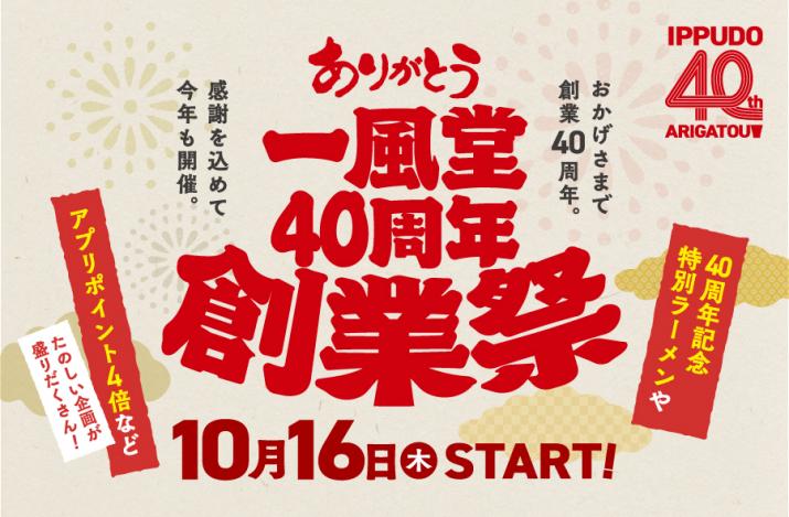 株式会社力の源ホールディングス(本社:福岡市中央区、代表取締役社長:山根 智之)傘下の株式会社力の源カンパニーが運営する博多発祥の世界に展開するラーメン店「一風堂」は2025年10月16日(木)に創業40周年を迎えます。毎年恒例となっている「創業祭」企画として、今年は「一風堂公式アプリ」のお得なキャンペーンや、10月16日の「世界食料デー」に合わせた3日間の「替玉募金」、創業祭記念メニュー「高濃度BRIXラーメン」および「U400」の限定販売、オリジナルデザインの丼プレゼント企画を実施いたします。