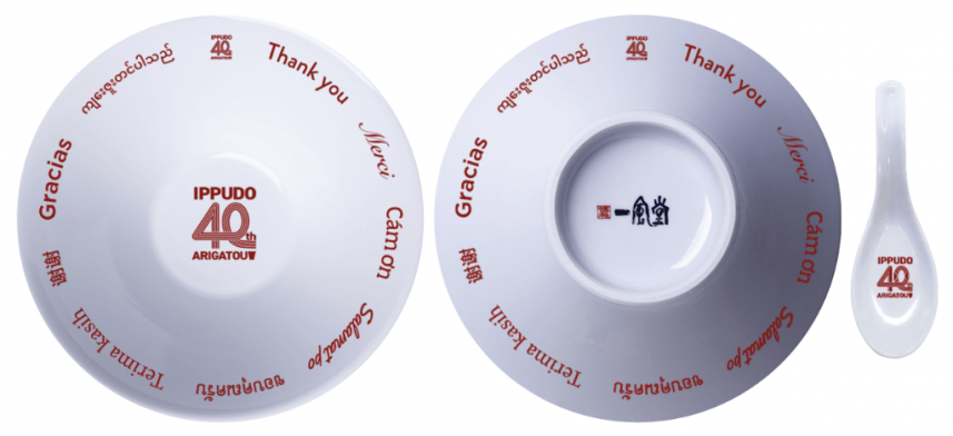 40年間の感謝の気持ちを込め、期間中に国内の一風堂でお食事をされたお客様を対象に、オリジナルデザイン丼と40周年ロゴ入りれんげのセットを抽選で400名様にプレゼントいたします。丼のふちには、現在一風堂が展開している世界16カ国・地域の主な言語で「ありがとう」をあしらいました。一風堂店舗で使用しているものと同じ、耐久性に優れた有田焼の丼です。