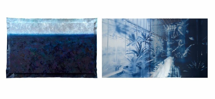 左:渡邉太地《Space#37》Oil on canvas/W1780×H1175mm/2025 右:《liminal paint_Crystal Palace#2》 W1167×H657×D50mm/2025