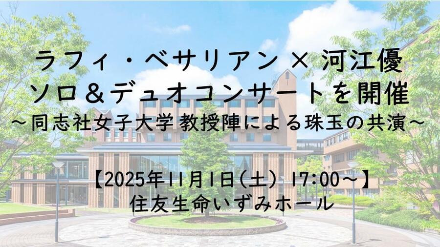 同志社女子大学(所在地:京都府京田辺市・京都市 学長:川崎 清史)学芸学部音楽学科では、この度、本学音楽学科教員によるソロ&デュオコンサートを開催いたします。本公演では、クラシックの名曲から現代作品まで、2人の個性が交差する多彩なプログラムをご用意しています。ソロ演奏と2台ピアノによるデュオ演奏を通じて、深い音楽的対話を体感できる一夜です。
