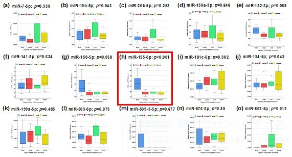 今回我々は、早期乳癌の乳腺組織を用いて、脳/肺/肝/骨単独再発を来した患者4群に分けた。乳癌脳転移との関連が報告されている15種類のマイクロRNAを発現比較したところ、hsa-miR-155-5pが脳単独再発群で有意に発現が上昇していた(p<0.001)。
