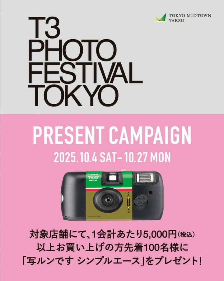 10月4日(土)~10月27日(月)までのT3 PHOTO FESTIVALの期間中、東京ミッドタウン八重洲の対象物販店舗にて1会計あたり5,000円(税込)以上お買い上げの方、先着100名様に「写ルンです シンプルエース」をプレゼントします。お買い物をしながらアート作品も楽しめる期間に、ぜひインスタントカメラを手に入れて街に繰り出してみてください。