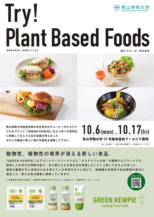 青山学院大学(本部所在地:東京都渋谷区、学長:稲積 宏誠)は、キユーピー株式会社(本社:東京都渋谷区、代表取締役 社長執行役員:髙宮 満、以下キユーピー)との産学連携プロジェクトとして、将来を担う若い世代に「GREEN KEWPIE」を広めるための共同プロジェクトを2024年12月に始動した。産学連携プロジェクトの集大成として、GREEN KEWPIEのドレッシングなどを使った限定メニューを販売するイベント「Try! Plant Based Foods」を、2025年10月6日(月)から2週間、青山キャンパスで学生向けに開催する。