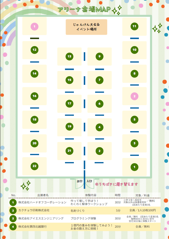 地元企業22社がお仕事体験の機会を提供。子どもたちに職業選択や夢を描くきっかけにしてもらう。「じゃんけん大会」や「キッチンカー」も。午前10時~午後3時。