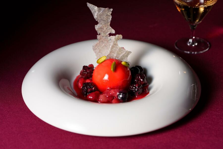 愛しい方とのかけがえのないひとときや、プロポーズのメッセージを伝えるには絶好のロケーション。レッド・グリーンなどのクリスマスカラーをモチーフに、シャンパンやフリーフローのワインなどとともに楽しめる料理の数々が並びます。オードブルは、オマール海老のカダイフ巻きや、蟹のタルトレット、サーモンとビーツのタルタル、フォアグラとマスカルポーネチーズのグジェールなど、全8品をティースタンドで提供。メインディッシュは、国産牛を赤ワインで軽く煮込んだこころをも満たす温かい一皿。ほろ苦い雪菜のマッシュポテトとともにお楽しみいただけます。デザートは、ピスタチオのペーストを、クリスマスオーナメントに見立てた洋なしのムースで包み込みました。甘酸っぱいベリーのソースとともにお召し上がりください。
