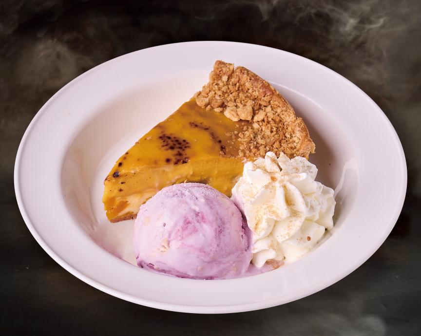 また、カフェタイムのお供やお食事のラストを飾るデザートとしておすすめの、パンプキンカスタードタルトに生クリーム、シナモンシュガー、紫芋アイスクリームをトッピングした「ハロウィン パンプキンタルト」をご用意しました。