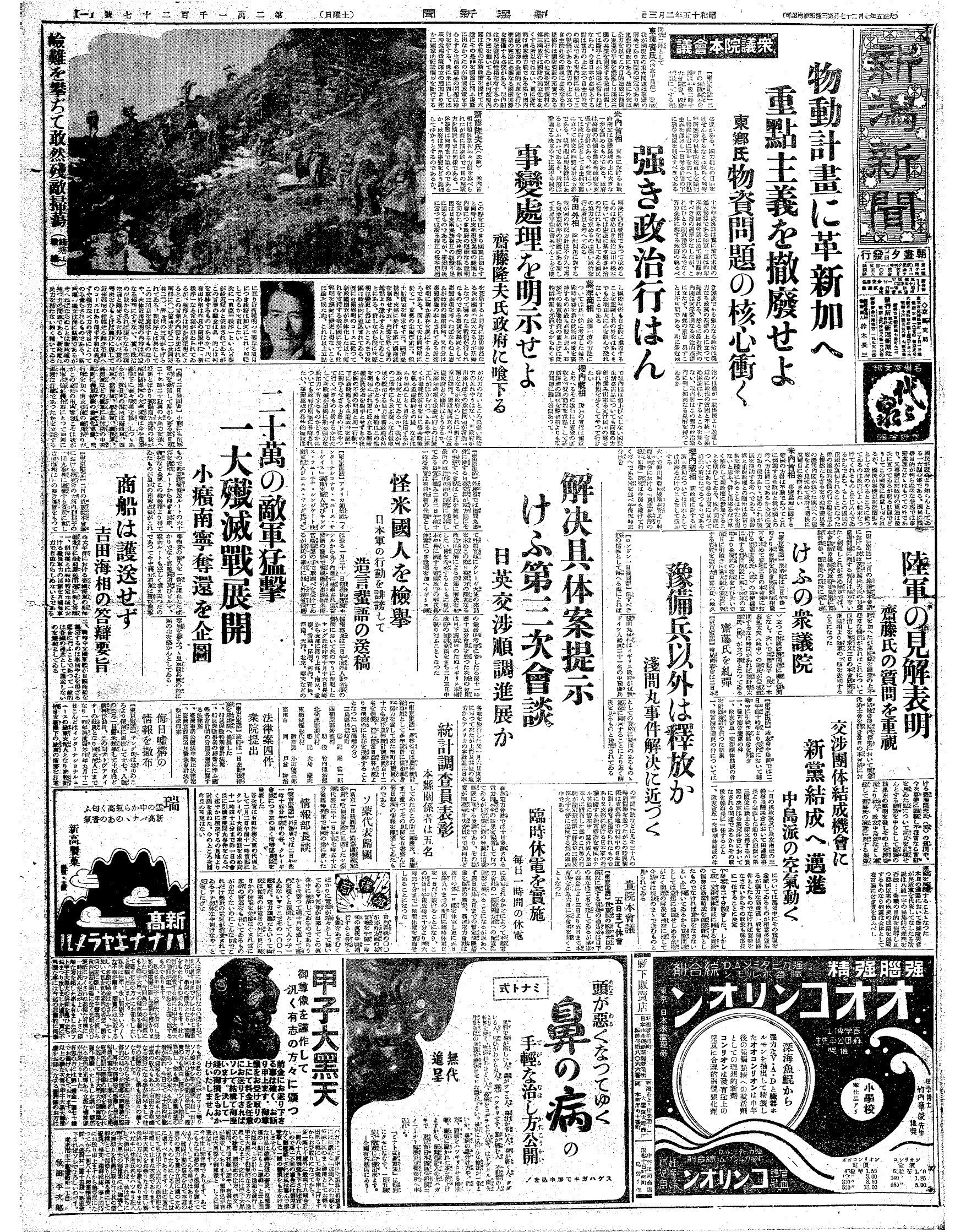 「反軍演説」は1940(昭和15)年2月2日に国会で行われた。新潟日報の前身の一つ、新潟新聞の翌日付の紙面が残っている。