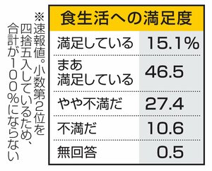 社会 現在の食生活に「満足」61・6%、過去最低水準の見通し…内閣府世論調査、物価高が影響か 2025/10/11 10:00 内閣府は、国民生活に関する世論調査の速報値を公表した。食生活に「満足している」「まあ満足している」との回答は計61・6%にとどまった。調査方法が異なるため単純比較できないものの、同様の質問がある2008... 残り388文字(全文:490文字) ここから先を読むには 続きを読む(会員登録する) 続きを読む(ログイン) 新潟日報朝刊を購読していますか? はい いいえ トップページで最新情報を見る 関連ニュース 新潟駅リニューアルでまさかの「相乗効果」!?万代も客増加、イ... 12/17 クマ出没増で見附市が鳥獣の捕獲や追い払いを強化へ 猟友会員ら... 12/17 [新潟大学・新学長選考]過程の不透明さを指摘「票数開示や判断... 12/17 生徒に「かわいい」…教職員の不適切な言動10件、新潟市教育委... 12/17 犯人蔵匿などの疑い、元県警警察官の探偵業の男ら2人再逮捕 12/17 「NIPPON防災資産」に三条市水防学習館を認定 第2弾7府... 12/17 新日本海フェリーが虚偽報告、火災訓練していないのに「実施」 ... 12/17 地場食材を地元シェフが調理 南魚沼市で雪国青年会議所が関係者... 12/17 新潟国際情報大、越智敏夫学長を再任 2026年4月から2期目 12/17 新潟県内5郵便局に軽バン使用停止の行政処分[日本郵便・酒気帯... 12/17 【アスベスト労災認定】2024年度は過去最多1257事業所、... 12/17 燕市の地下水から基準値上回るヒ素検出、新潟県が追加調査 地質... 12/17