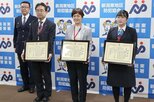 ノーベル生理学・医学賞の受賞が決まり、記者会見場で花束を受け取る大阪大の坂口志文特任教授(右)=6日、大阪府吹田市