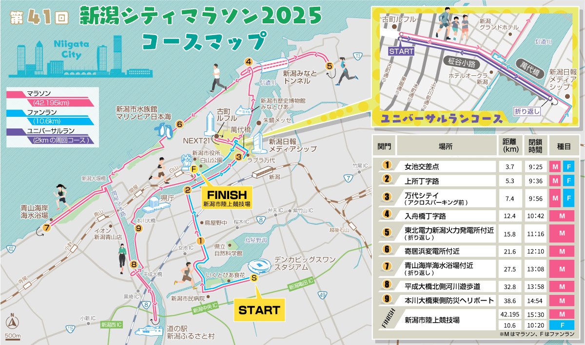 市民ランナーらが県都を駆け抜ける第41回新潟シティマラソン(新潟市などが主催)が12日、開かれる。参加者拡大に向けた取り組みが功を奏し、今年は県外と海外からの申し込みが過去最高となり2016年以来、1万3千人を超えるエントリーがあった。フルマラソン、車いすランナーも一緒に走る10・6キロのファンランに加え、障害の有無や年齢に関係なく萬代橋周辺を周回するユニバーサルランの3コースを用意。ランナーの栄養補給を助けるフードエイドステーションは、米菓など充実したラインアップを今年も展開する。号砲を前に、コースの見どころやランナーを支える応援団などを紹介し、経験豊富なゲストランナーに完走のこつや楽しみ方を聞いた。
