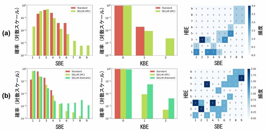 b:IGZO-TFTの接触抵抗課題について、Standardと国際特許分類(IPC)または元素(Element)のリストからSELLMで生成した解決策の評価結果。左のグラフはSBEの点数分布を、中央のグラフはKBEの点数分布を示す。SBEとKBEの詳細は図2参照。右のグラフはSELLMで生成された一部の解決策で、HBEとSBEの関係を示す。