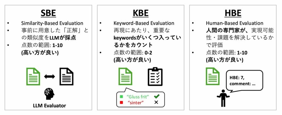 生成された解決策の評価を行うために、3種類の方法で採点を行いました(図2)。1つ目は、先行研究で提案された解決策をあらかじめ「正解」として設定し、これに対する類似度をLLMに評価させることで評価(Similarity-Based Evaluation, SBE)を行いました。2つ目は、解決策のテキストの中に重要なキーワードがいくつ入っているのかをカウントすることで評価(Keyword-Based Evaluation, KBE)を行いました。3つ目として、人間の専門家が直接解決策の中身を確認して、解決策の実現可能性や課題を解決できているかどうかで評価(Human-Based Evaluation, HBE)を行いました。