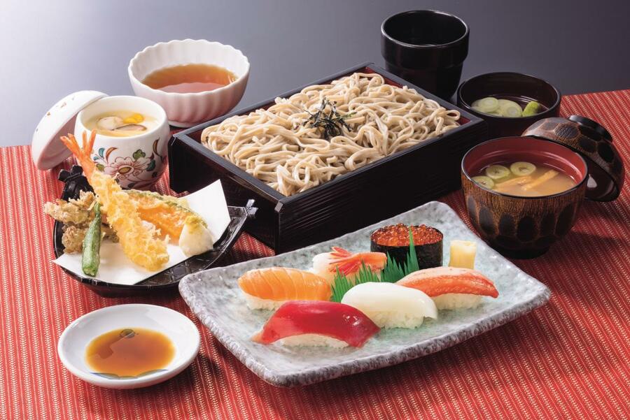 鮨・北海道そば・天ぷら・茶わんむしの、とんでん自慢の4品が1度にご堪能いただける御膳です。まぐろ・かに・いくらなど6貫の鮮度の良い鮨と、日本一のそばの産地である北海道・幌加内産のそば粉を使用し、自社工場で製造している北海道そばや、さくっと揚げた天ぷら、だしの効いた茶わんむし、みそ汁がセットです。