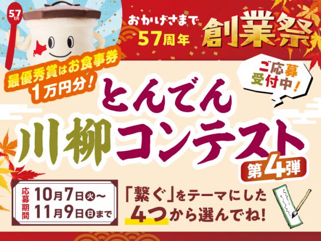 創業祭のテーマである“繋ぐ”にまつわる4つのテーマで募集する、「第4回とんでん川柳コンテスト」を、10月7日(火)~11月9日(日)の期間で開催。とんでん公式アプリ又はとんでん創業祭特設サイトからご応募いただけます。指定する4つのテーマの中から、お好きなテーマをお選びいただき、最大5句までご応募を受け付けております。