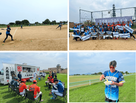 試合前には、阪神タイガーススペシャルアンバサダーの糸井嘉男氏、四国アイランドリーグplusで活躍する選手をお招きして、トリドールグループ従業員を対象とした野球教室を開催しました。糸井氏や選手の方々とキャッチボールやバッティング練習を行い、本格的なご指導をいただく中で、野球の楽しさを体感する貴重な機会となりました。また、参加者には丸亀製麺キッチンカーで手づくり・できたてのうどんが振る舞われました。