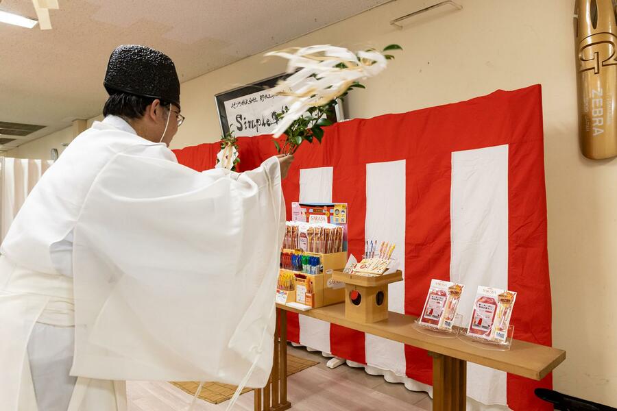 2025年9月、ゼブラの生産拠点である野木工場にて、「サラサクリップ 勉強応援」の学業成就祈願祭を執り行いました。当日は、地元の野木神社神職を迎え、工場内に特設された祭壇にてご祈祷が行われました。今回発売する全ての「サラサクリップ 勉強応援」に、ゼブラの社長と社員が描いた絵馬も供えられ、学業に励む全ての人が力を発揮できるよう、心を込めてご祈祷いたしました。