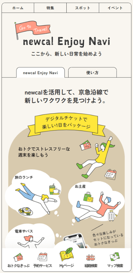スマートフォンでの閲覧が95%以上であることを考慮し,サイトを訪問した際の最初の画面におトクなデジタルきっぷの購入を促すポップアップを表示するなど,きっぷ購入やアクティビティ予約への導線を最適化しました。また,チケットの使い方や活用例などの「newcal」でできることを紹介する「Enjoy Navi」を新設することで,サイトの機能利便性とメディア性をユーザーに説明します。