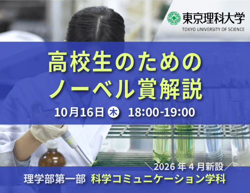 東京理科大学(学長:石川 正俊)は、2026年4月、理学部第一部に「科学コミュニケーション学科」を新設します(神楽坂キャンパス/入学定員80名)。本学科は「科学をわかりやすく社会へ発信し、科学と社会の架け橋となる人材の育成」を目的としており、その理念を体現する企画として、就任予定の教員によるイベント「高校生のためのノーベル賞解説」を2025年10月16日(木)に開催いたします。