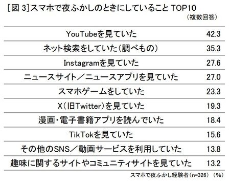 スマホの利用で夜ふかしをした経験がある326人に、何をしていて夜ふかしをしたのかを聞きました。すると、「YouTubeを見ていた」(42.3%)、「ネット検索をしていた(調べもの)」(35.3%)、「Instagramを見ていた」(27.6%)が上位に挙げられました[図3]。