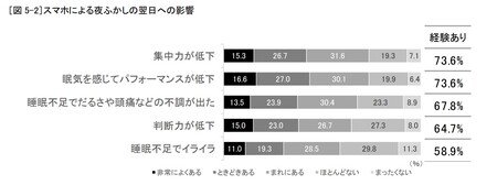 また、スマホによる夜ふかしの翌日への影響について聞くと、 7 割以上が「集中力が低下」( 73.6 %)したり、「眠気を感じてパフォ ーマンスの低下」( 73.6 %)した経験があると答え、「睡眠不足でだるさや頭痛など身体的な不調が出た」( 67.8 %)を訴える人も 6 割を 超えています[図 5-2 ]。このような影響を実感しながらもなかなかやめられない…。スマホによる夜ふかし問題の根深さが垣間見える結果です。