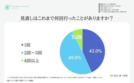 「これまでに保険の見直しを何回行ったことがあるか」では、「1回」が43.0%、「2~3回」が49%と続き、4回以上の経験者は7.4%にとどまりました。