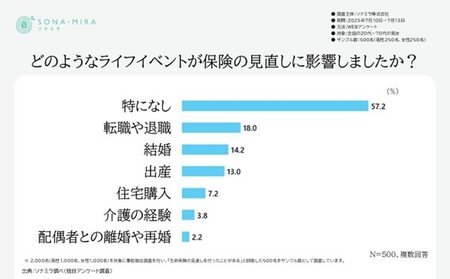 一方、「特になし」(特定のイベントなしで見直した)が57%と半数超を占め、必ずしもライフイベントが契機ではないケースも多いことがわかります。