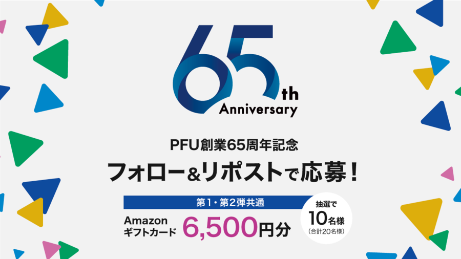 PFU創業65周年を記念して、PFU公式X(@PFU_JP)にて、抽選でAmazonギフトカード6,500円分が合計20名に当たる、フォロー&リポストキャンペーンを開催します。
