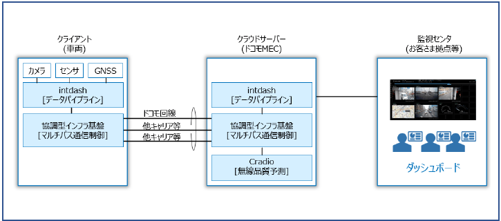 車両等のデバイスで収集したカメラ映像やセンサデータ、通信状況情報を集約し、複数のデータをリアルタイムで遠隔監視システムに連携(intdash※4を活用)