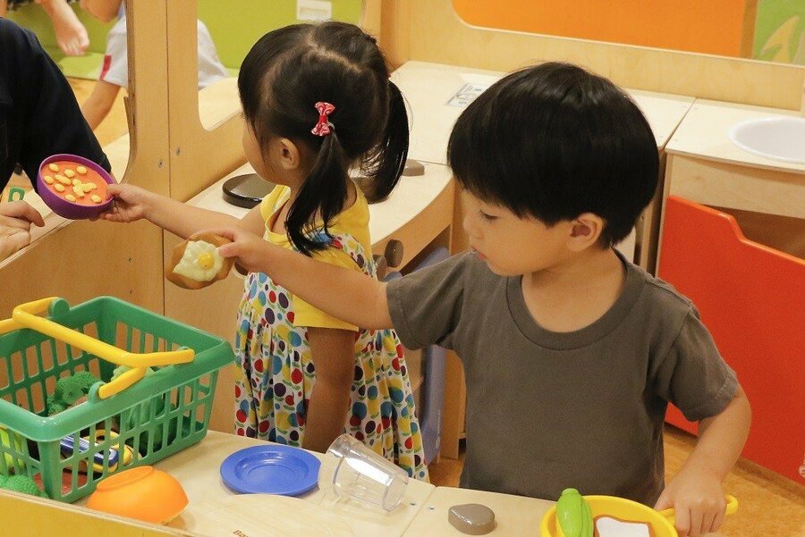 ままごとやブロックなど、静のあそびが楽しめるエリア。親子や子ども同士のコミュニケーションを誘発し、想像力や発想力を育むあそびが揃っています。