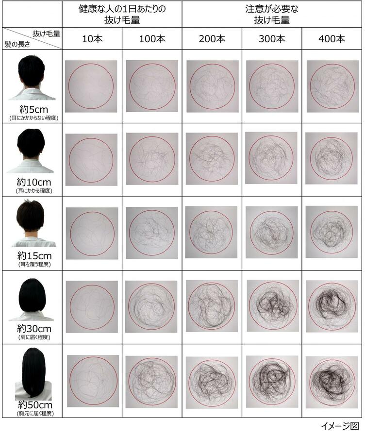 そこで、自分の抜け毛量をイメージしやすいように、髪の長さ別に1日の抜け毛量を可視化しました。その結果、同じ抜け毛本数であっても、髪の長さによって印象が大きく異なりました。