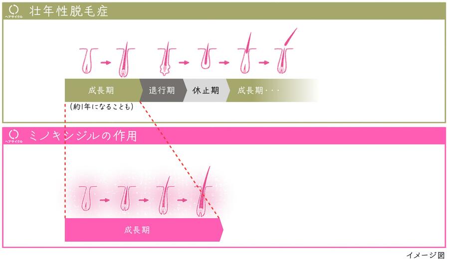 ※2 進行性の脱毛のすべてが、壮年性脱毛症であるとは限りません。壮年性脱毛症以外の脱毛症であったり、脱毛が他の原因によるものである可能性があります。急激に脱毛したり、髪が斑状に抜ける場合は壮年性脱毛症以外の可能性が高いので、医師又は薬剤師にご相談ください。