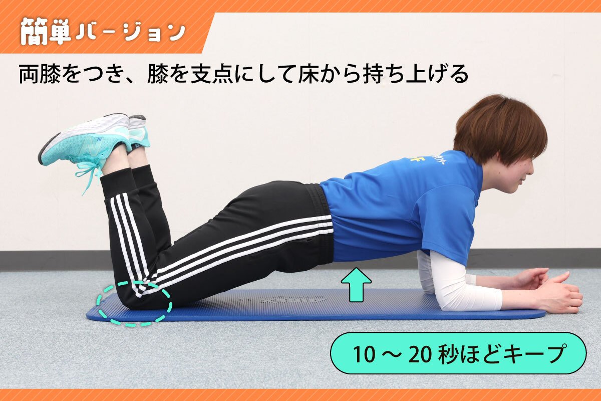 【簡単バージョン】両膝をつき、膝を支点にして床から持ち上げる。10~20秒を目安にキープ。