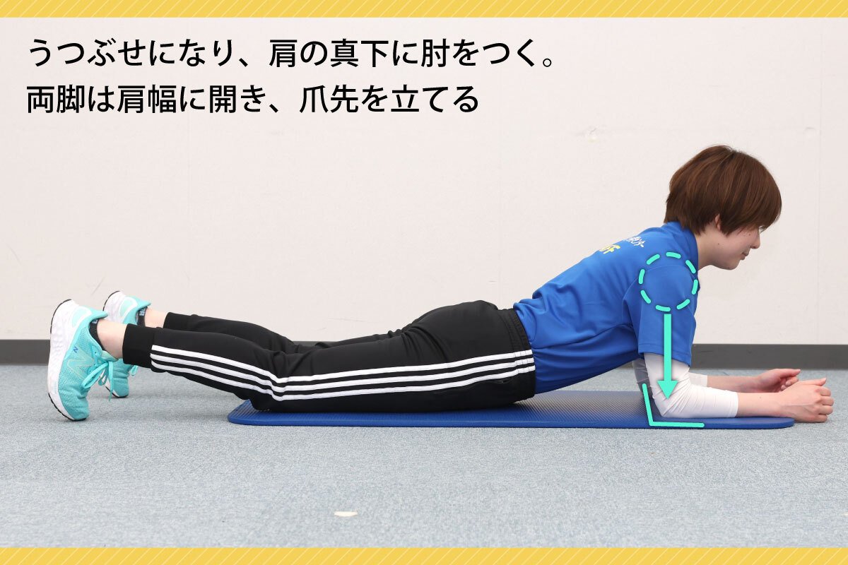 (1)うつぶせになり、肩の真下に肘をつく。両脚は肩幅に開き、爪先を立てる。