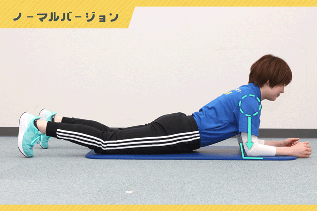 今回は腰痛を予防する動きです。「プランク」ともいわれるトレーニングで、胴体部分を鍛え、骨盤を正しい位置にするのに効果的です。体勢がきつい方は両膝をついて、膝を支点にして両足の足先を上げて行うと良いでしょう。