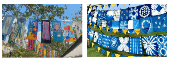 神南小学校の4年生の児童や地域で活動する事業者を対象に、スポーツイベントや参加アーティストを応援するフラッグの制作ワークショップを事前に実施しました。児童や地域事業者が作成した100点以上の応援フラッグは、北谷公園の内外に展示され、2日間限定で神南のまちなかをカラフルに彩ります。