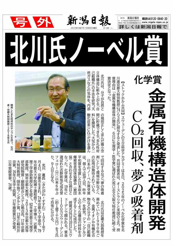 【号外】ノーベル化学賞に北川進京都大特別教授 2025/10/8 19:55 (最終更新: 2025/10/8 19:57) PDFで号外を見る トップページで最新情報を見る 関連ニュース 【号外】新潟県知事が柏崎刈羽原発再稼働を容認 11/21 【号外】日経平均初の5万円台 10/27 【号外】新首相に高市早苗氏、女性で初めて選出 10/21 【号外】燕市の新市長に前市議の佐野大輔氏 10/20 【号外】北信越高校野球・帝京長岡が優勝 10/19 【号外】公明党が連立政権離脱へ 10/10 【号外】ガザ全人質解放へ 10/9 ノーベル化学賞に京都大特別教授の北川進氏ら 10/8 【号外】ノーベル生理学・医学賞に大阪大栄誉教授の坂口志文氏ら3氏 10/6 【号外】自民党新総裁に高市早苗氏 10/4 【号外】石破茂首相が辞任の意向 9/7 【熱中症に注意】新潟県内に熱中症警戒アラート発表中(8月26日) 8/26
